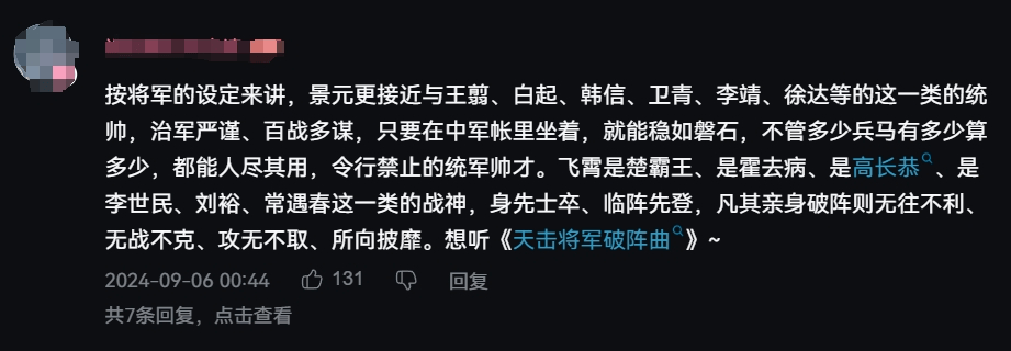 这与同样身为帝弓七天将之⼀,向来以智谋闻名的景元将军,在剧情中形成了鲜明的对比。正如玩家们在角色PV评论区里说的那样,飞霄的身上其实有着古代名将常遇春、霍去病等人的影子。性格豪爽,和谁都能聊得来,上了战场永远冲在最前面,身负百般武艺,能轻松做到以一敌百,是整军中最令敌人闻风丧胆的存在,也是最不把自己的性命当回事的将领。