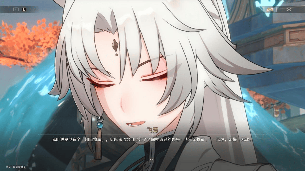 飞霄在2.4剧情中初登场时,玩家并不了解她的故事,只知道她仅凭一人之力,就接下了来自彦卿和云璃的两把剑的重击,还是在未使出全力的情况下。之后,她又仅凭一句话就道破了两人在剑法上的不足,同时在介绍自己时,自称“三无将军”——无虑、无悔、无敌,尽显作为“大捷将军”的实力和狂气。