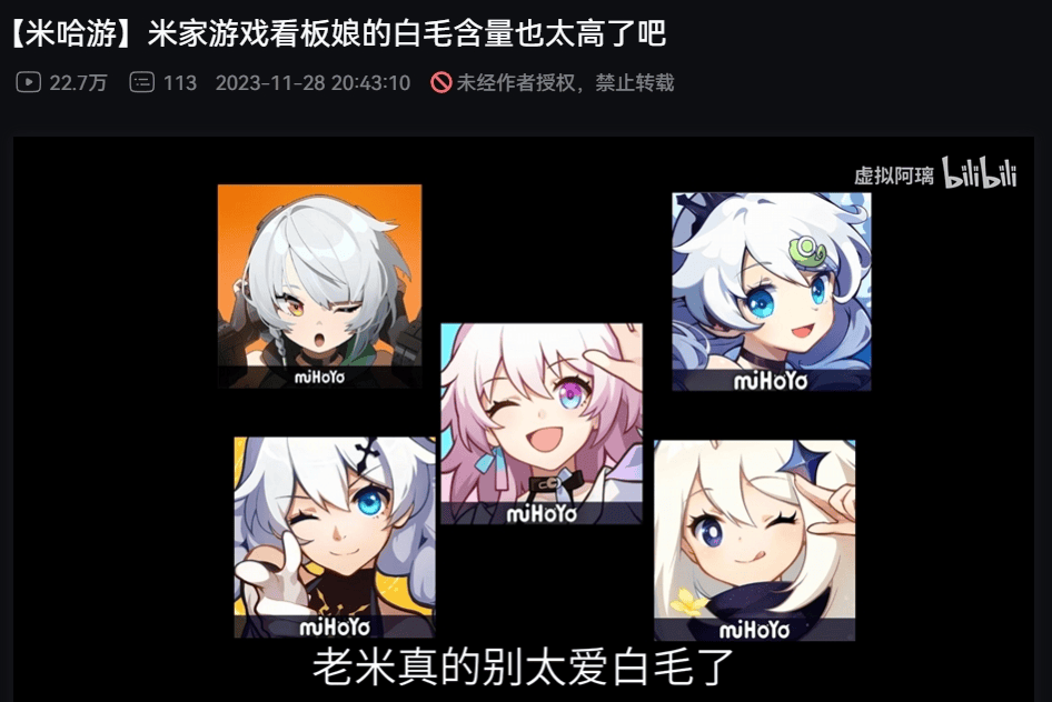 从《崩坏3》中凭借一头白发双马尾给人留下邻家少女印象的女主角琪亚娜,到《原神》的高人气白发御姐申鹤,再到《崩坏:星穹铁道》1.0剧情中登场的红衣白毛萝莉克拉拉,以及在最新的《绝区零》中担当战力天花板白毛看板娘11号。毫不夸张地说,这几年米哈游的游戏算是把各种类型的白毛女角色都吃遍了,以至于在人均白毛控的中国玩家眼中,对白毛角色情有独钟,已经成了米哈游作品最常见的标签之一。
