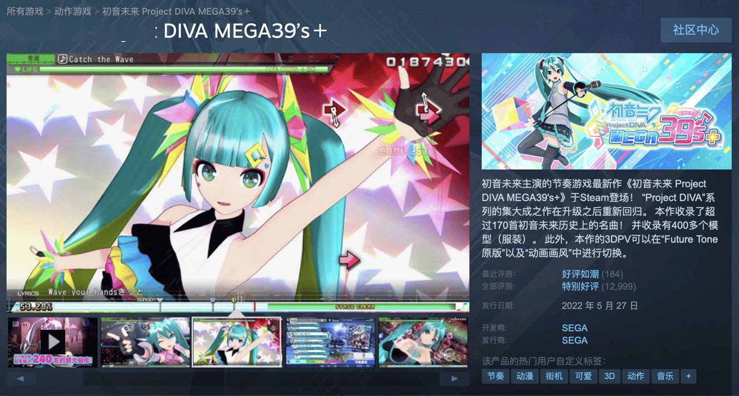 本作于2022年5月27日登陆Steam平台,好评率 93%“特别好评”,游戏主要包含170首以上的歌曲,收录带有初音 3D 模型的 3DPV 及原曲 PV,本作的 3DPV 画面还可以在接近现实的“Future Tone”风格与接近动画的“MEGA39's”风格之间进行切换。