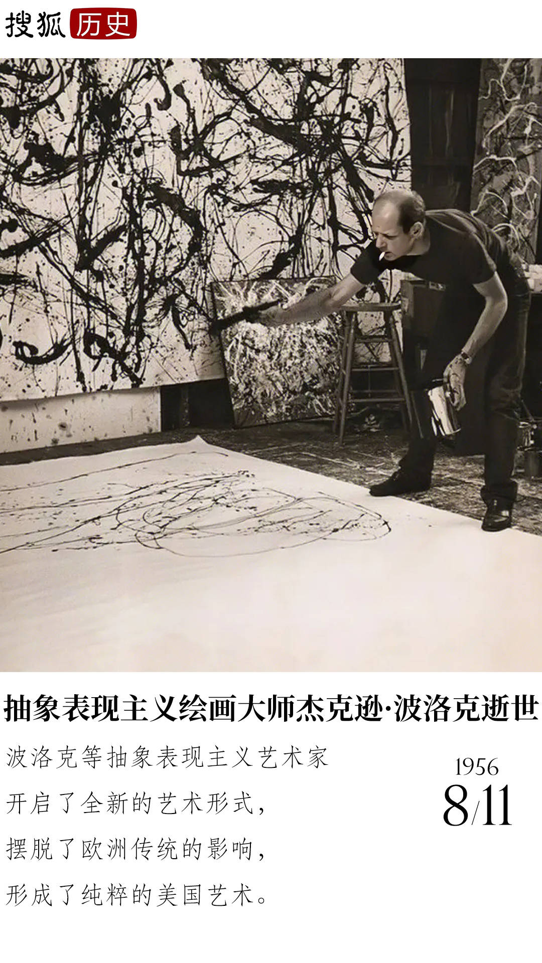 1956年8月11日,美国抽象表现主义绘画大师杰克逊·波洛克逝世。1947年他从象征艺术上转移,并发展了一个在帆布上喷涂和滴颜料的绘画技术,创造了举世闻名的“滴画”。波洛克被公认为是美国现代绘画摆脱欧洲标准,他的绘画作品风格独特,形式感强,具有不可复制性。波洛克的一生大部分时间在隐居,很长时间都在与酗酒做斗争。代表作有《秋韵:第30号》《薰衣草之雾:第1号》《大教堂》《蓝杆:第11号》等。