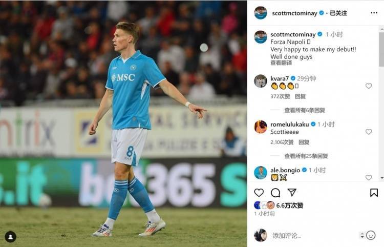 麦克托米奈在社交媒体上晒出自己的赛场照片,并写道:“加油那不勒斯。很高兴上演首秀,做得好兄弟们。”