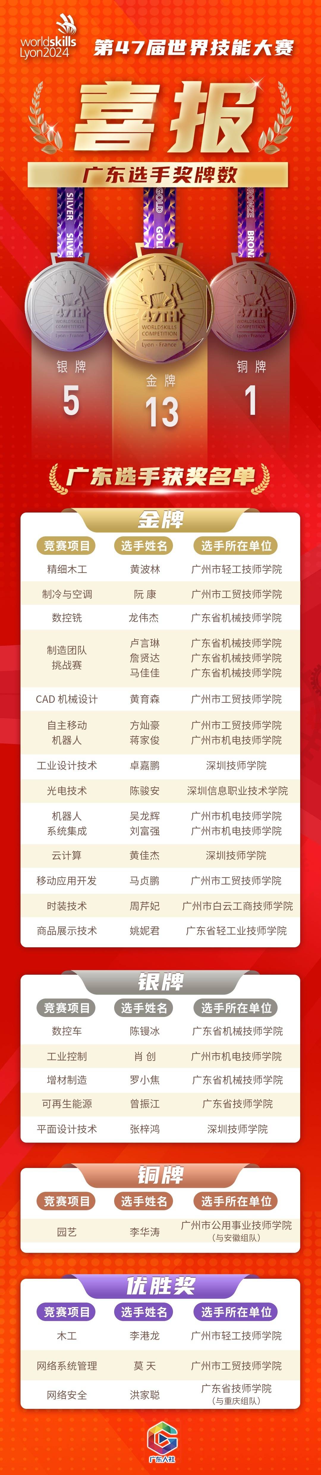 在刚刚闭幕的第47届世界技能大赛上,广东共派出27名选手参加23个项目比赛,最终交出一张13金5银1铜3优胜的成绩单。
