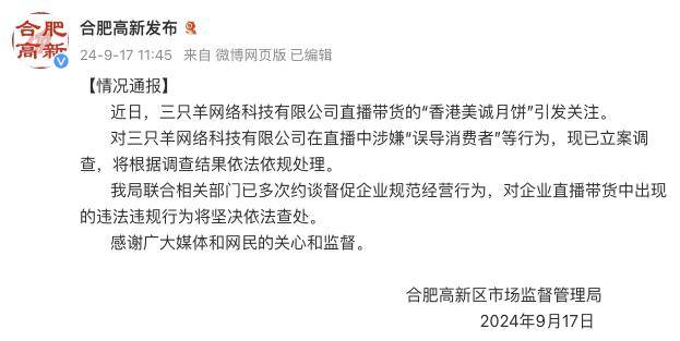 9月17日,合肥高新区市场监督管理局发布情况通报: