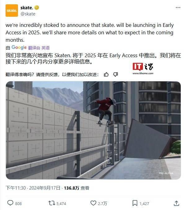 IT之家 9 月 18 日消息,EA 公司昨日(9 月 17 日)在 X 平台发布推文,宣布将于 2025 年启动《skate.》(全小写,带句号)游戏抢先体验活动,并在未来几个月内分享更多游戏细节。