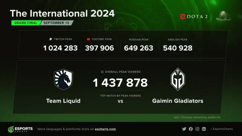 从数据来看,这是“最安静”的一届ti。据国外数据统计网站Esports Charts统计,2024DOTA2国际邀请赛液体和GG的决赛观众峰值为143万7878。而这场比赛也是本次DOTA2国际邀请赛观众峰值最高的比赛。
