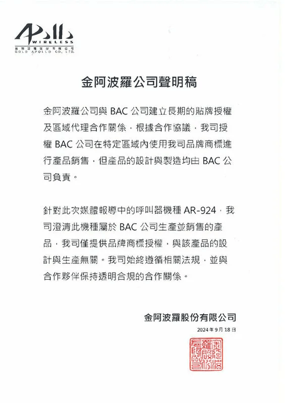 “针对此次媒体报道中的呼叫器机种AR-924,我司澄清此机种属于BAC公司生产并销售的产品,我司仅提供品牌商标授权,与该产品的设计与生产无关。我司始终遵循相关法规,并与合作伙伴保持透明合规的合作关系。”