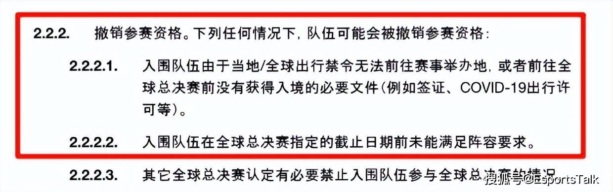 我们来看下拳头在前不久发布的2024全球总决赛赛事规则,在其中的2.2.2.1中有明确提出,入围的队伍没有获得入境的必要文件将被撤销参赛资格,2.2.2.2中也追加了“截止日期前未能满足阵容要求”的也将撤掉参赛资格。很明显,LNG似乎两条都符合。