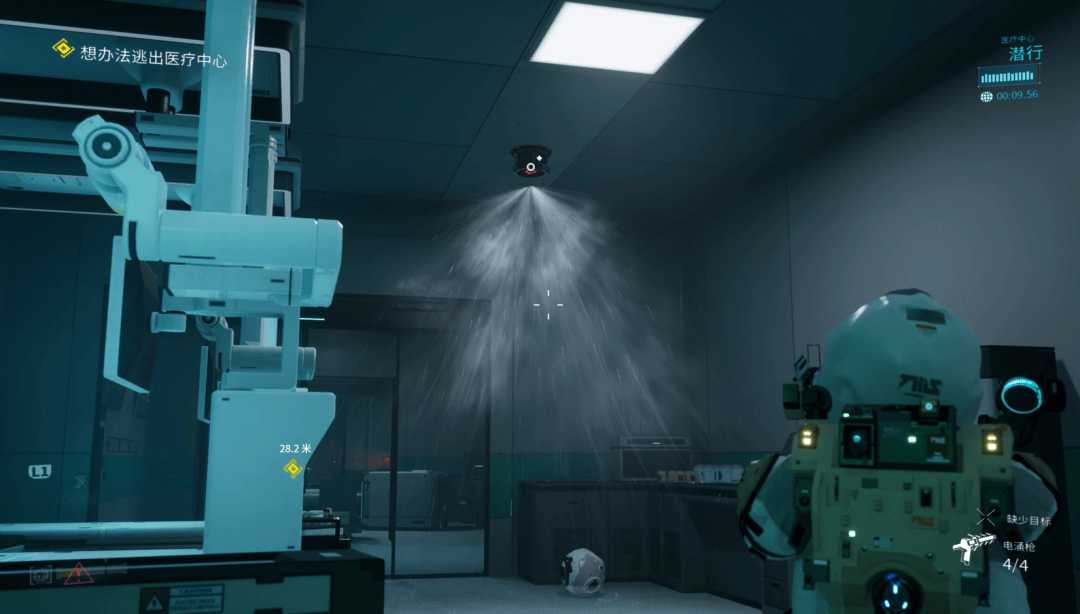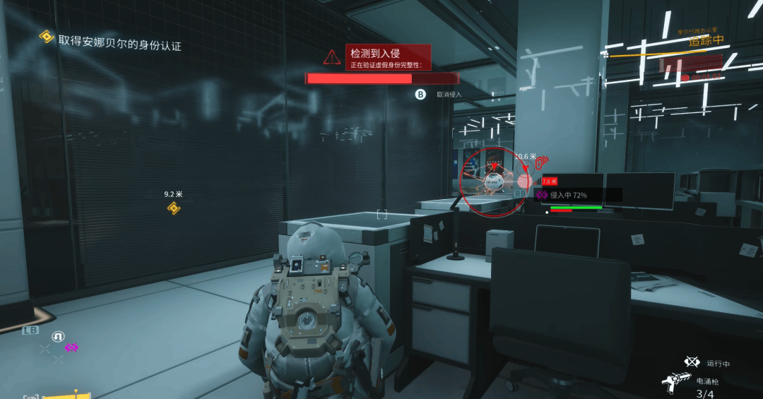 这个想法听上去很自然:玩家距离机器人较近的时候,信号更强,那骇入的速度势必更快,玩家为了不被发现,自己就会一边骇入,一边潜行靠近机器人来节省时间,但在主动靠近时,又有可能因为失误被发现——一个高风险高回报的玩法。