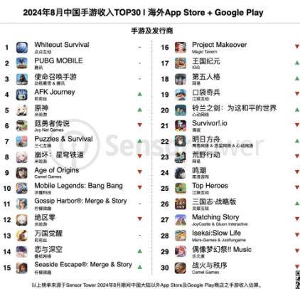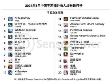 根据全球移动市场情报平台Sensor Tower发布的最新报告,2024年8月中国手游产品在海外市场取得了显著的收入与下载量增长。