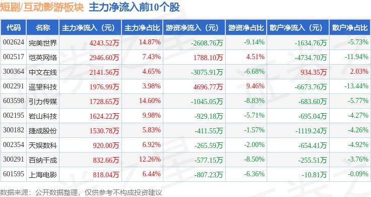 从资金流向上来看,当日短剧/互动影游板块主力资金净流入1.48亿元,游资资金净流出1.15亿元,散户资金净流出3218.0万元。短剧/互动影游板块个股资金流向见下表: