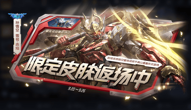 孙悟空的零号*赤焰将在9月20日返场上架,售价1788点券,目前该皮肤已在鹅毛市集和游市集中超前返场。