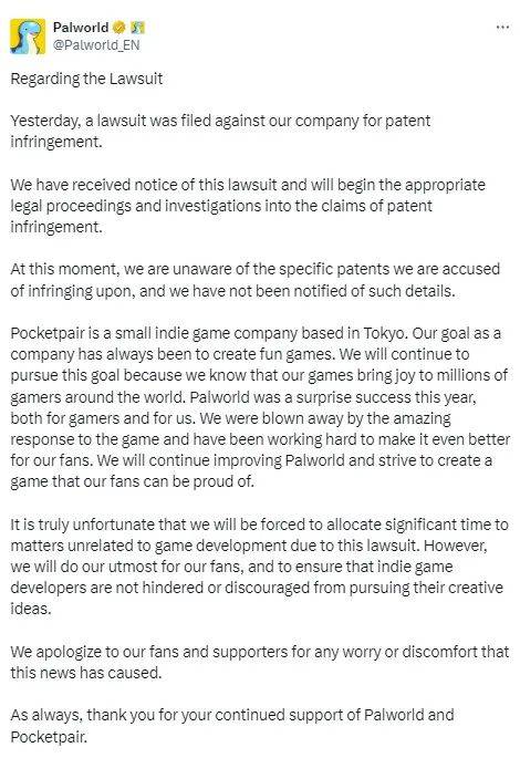 《幻兽帕鲁》官方也发文回应,表示目前已收到诉讼通知并进行相应调查。其公告称,目前,他们尚不清楚被指控侵犯了哪些具体专利,也没有收到有关此类详细信息的通知;同时他们也将继续改进《幻兽帕鲁》,努力制作一款让玩家感到自豪的游戏,并对这场诉讼对玩家带来的担忧和不适表示歉意,感谢玩家对《幻兽帕鲁》的支持。
