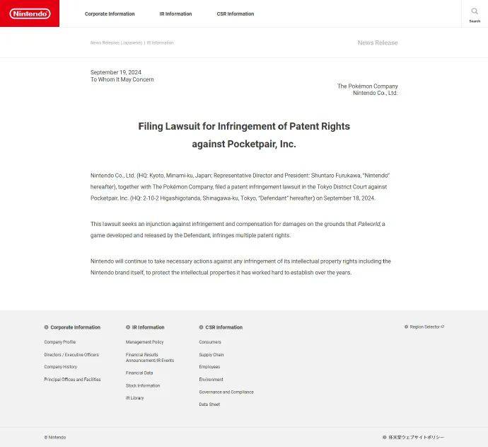 9月19日,任天堂和宝可梦公司(The Pokemon Company)正式发表声明,起诉《幻兽帕鲁》开发商Pocket Pair侵犯其“多个”专利。