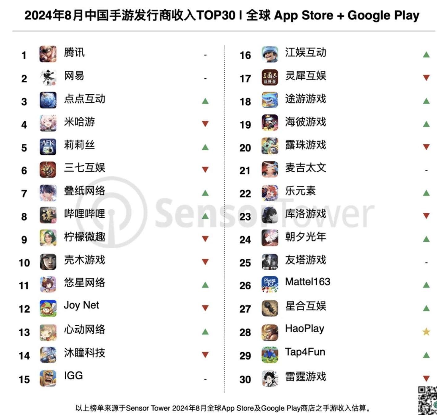 8月国内手游厂商收入Top 30 图片来源:Sensor Tower官网