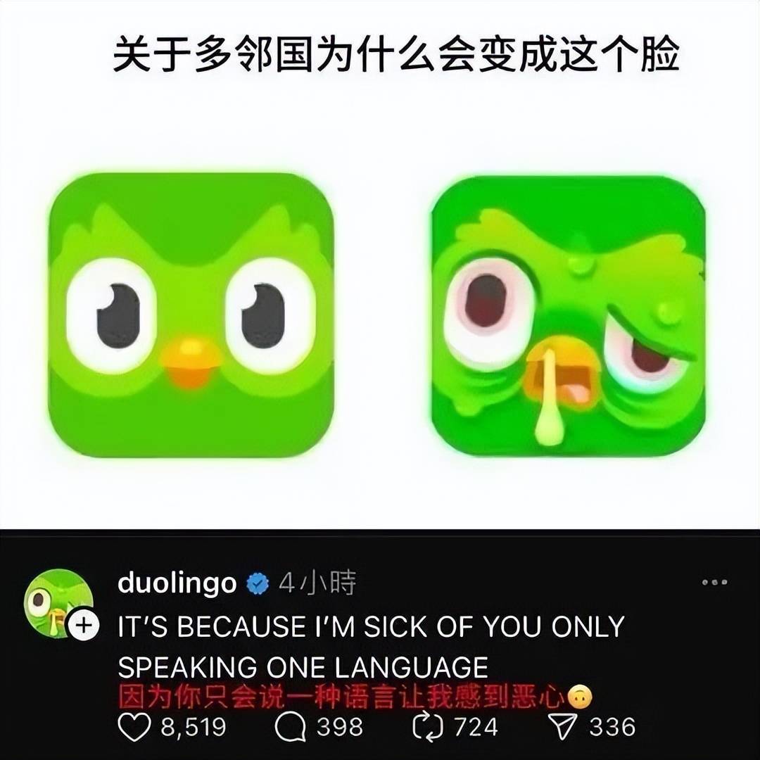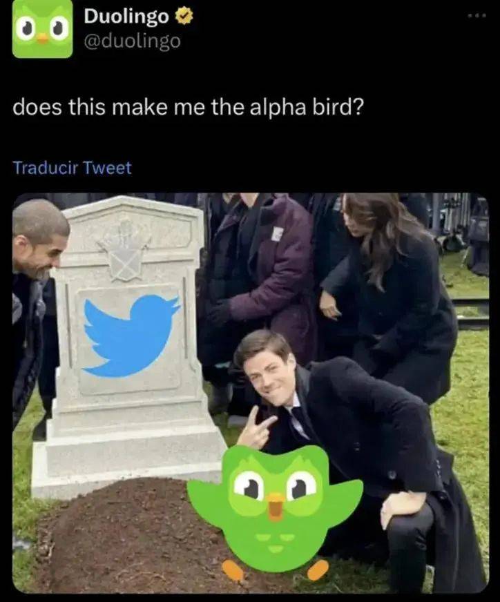 什么事它都能横插一脚。比如,当推特“小蓝鸟”成为往事,它的官方账号也能出来调侃:世界上只能火一种鸟,绿的。
