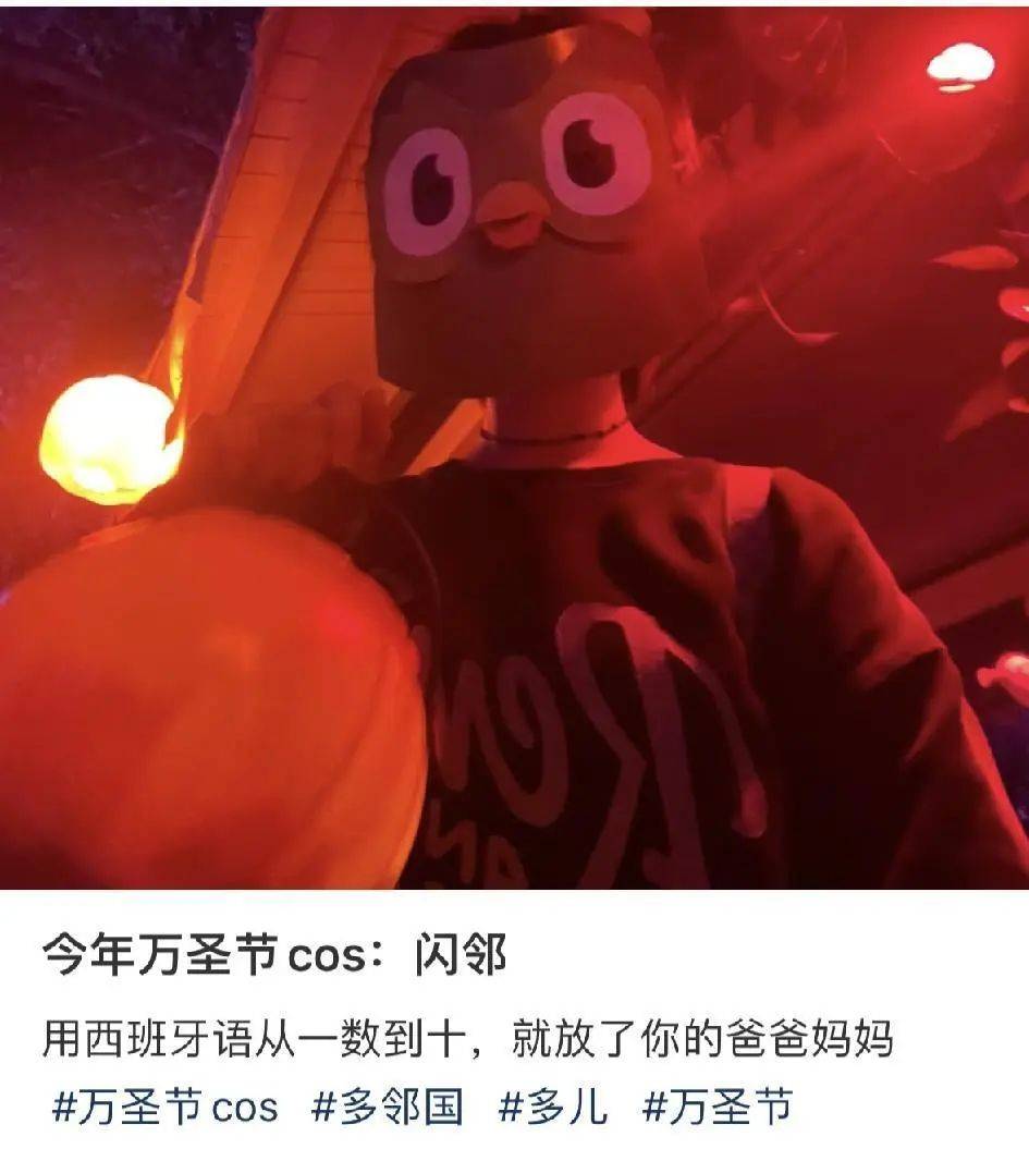 外国网友就直接将多邻国称作“闪邻”,有人甚至在万圣夜还COS起多儿和拽姐,多邻国都快恐怖出圈了。