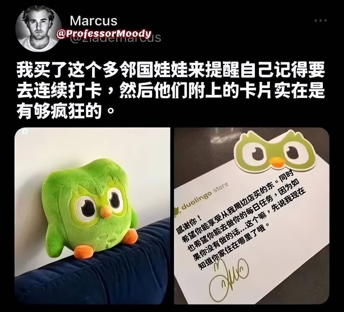 百变的小鸟简直成了多邻国的吉祥物,有人下载多邻国仅仅只是为了“观鸟”。但一旦你觉得这只鸟可爱,买入了周边,将会发现,追杀你学习的多儿已知道了你的地址。