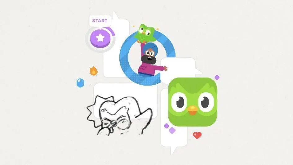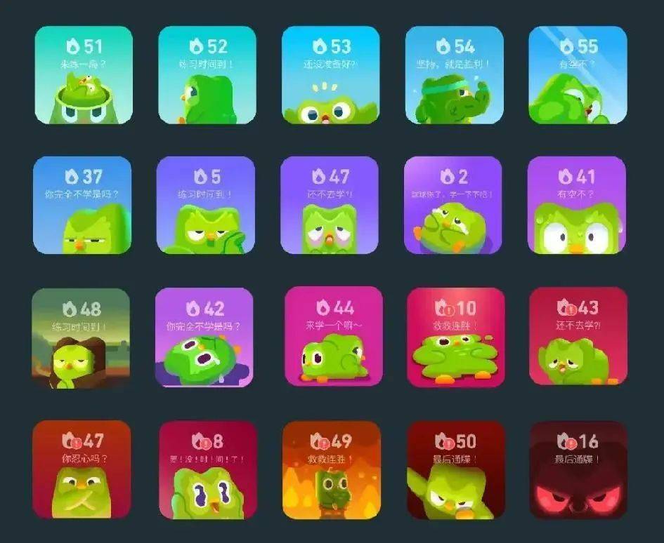 每个角色在学习过程中都有它们独特的故事线,多邻国设计副总裁 Ryan Sims 曾分享,他们设计了很多角色动画以确保语言课程不像书面功课那样枯燥,甚至有专门的团队来确保每个角色的故事都是互恰的。