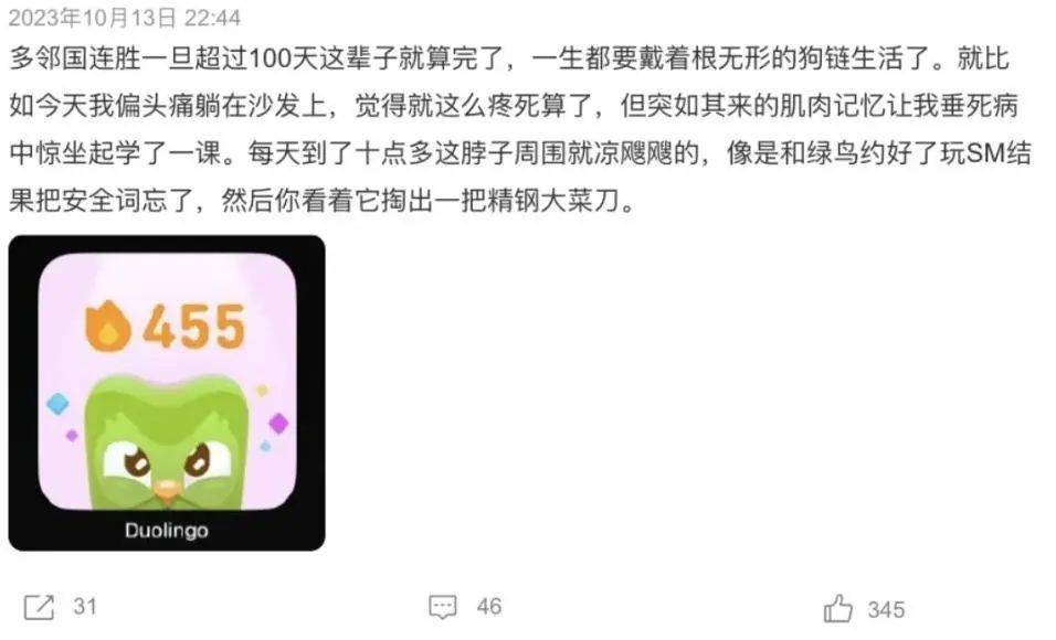 多邻国创始人路易斯在2023年TED演讲中骄傲地分享,连胜帮他绑住了用户,大家则咬着牙在社交媒体吐槽“多邻国连胜超过100天这辈子都要带着无形的狗链生活了”。