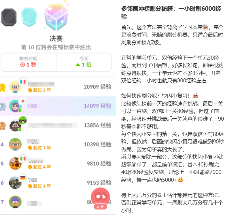 随着软件里排位等级的上升,竞争越来越激烈,排行榜上对手动辄两万经验值随时让人神经紧绷。社交网站上这款学习类APP的“偷榜”经验堪称游戏攻略贴,你需要在结榜前一天疯狂学习,遇到双倍经验的关卡反复重刷,这样就能保证冲上榜单。