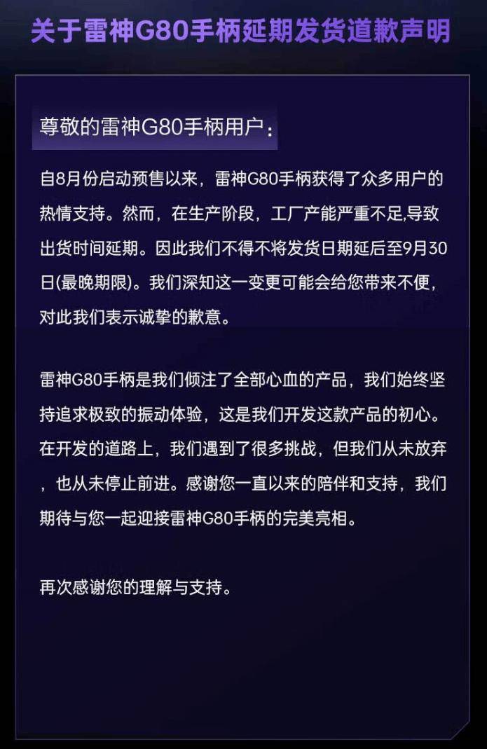雷神 G80 手柄的发货日期将会延期至 9 月 30 日(最晚期限)