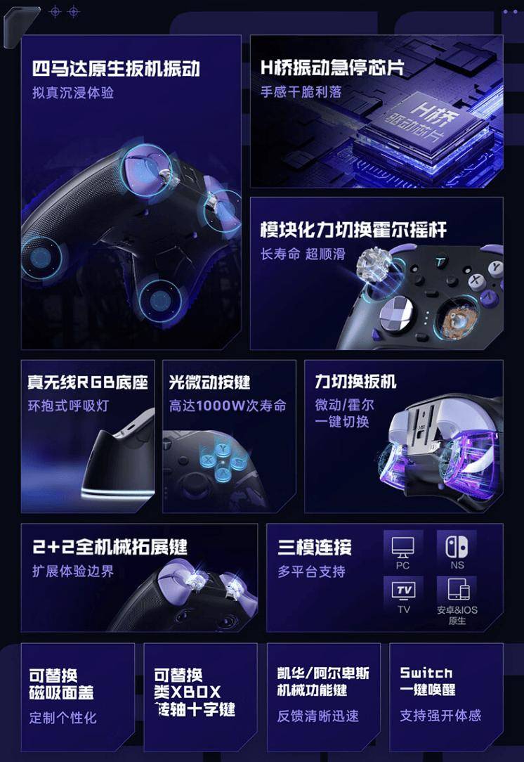 雷神 G80 游戏手柄内置 2+2 颗四转子马达,支持非对称马达振动 + 扳机振动;同时采用力切换扳机,支持微动霍尔双切换;配备“超 1000 万次寿命”的光微动按键。手柄亮点信息如下: