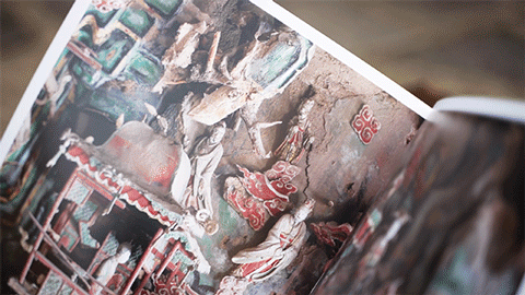 殿内故事连环悬塑更是精美至极。多达四百余尊,高四十厘米的彩塑,脚蹬彩云、山水,花木为托,让人忍不住赞叹变化无穷、满壁生风、巧夺天工。光这几页,就足够你欣赏一整个下午。👇