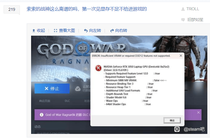 不少玩家反馈,《战神5》的内容优化欠佳。除了BUG问题以外,鼠标无法移动视角的问题,对于键鼠党来说很不友好。另有占据着极大玩家比例的1650显卡使用者,游戏体验受到了直接影响。显存不够充足的玩家,甚至都进不了游戏。
