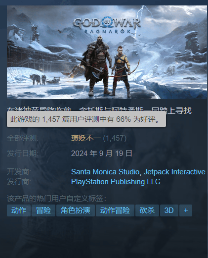 时隔两年,《战神5》这款索尼第一方游戏终于登陆了PC端。全球最大的数字游戏分销平台Steam,于今日正式上架了《战神5》。然而令人大跌眼镜的是,这款游戏的首日好评率却远低于玩家们的预期。首日的好评率仅66%,总评为“褒贬不一。”