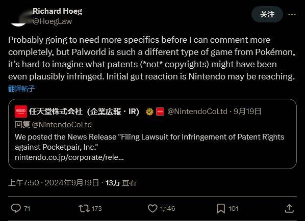 商业律师 Richard Hoeg 也因此认为,任天堂并不是十拿九稳。他在推特上写道:“在我可以更完整的发表看法前,可能需要更多细节,但《幻兽帕鲁》和《宝可梦》在游戏类型上差距很大,很难想象哪些专利(注意*不是*版权)可能受到了侵犯。我最初的直觉感受是,任天堂(的诉讼)可能有些牵强。”