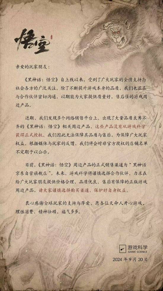 声明表示,目前《黑神话:悟空》周边产品的正式销售渠道为“黑神话京东自营旗舰店”。未来,游戏科学将谨慎选择合作伙伴,力求给广大玩家朋友提供价格合理,品质优良,售后有保障的正版游戏周边产品。请大家谨慎选择购买渠道,保护好自身权益。(文猛)