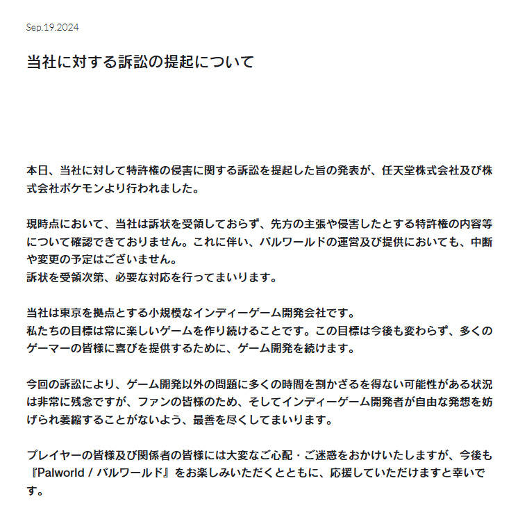 “今日,任天堂株式会社和宝可梦公司宣布,已就专利侵权对我公司提起诉讼。