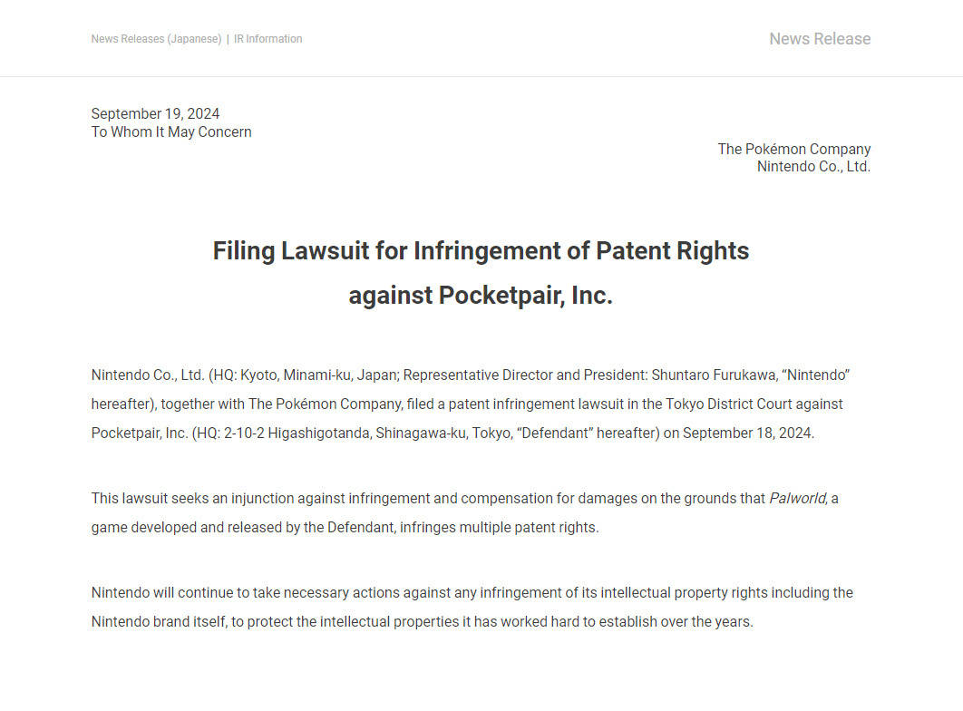 任天堂和宝可梦公司于昨日正式对《幻兽帕鲁》开发商Pocketpair提起专利侵权诉讼,任天堂也在今日公开了起诉公告。目前《幻兽帕鲁》开发商 Pocket Pair 已在官网和社交媒体上发布声明,对此进行了回应。