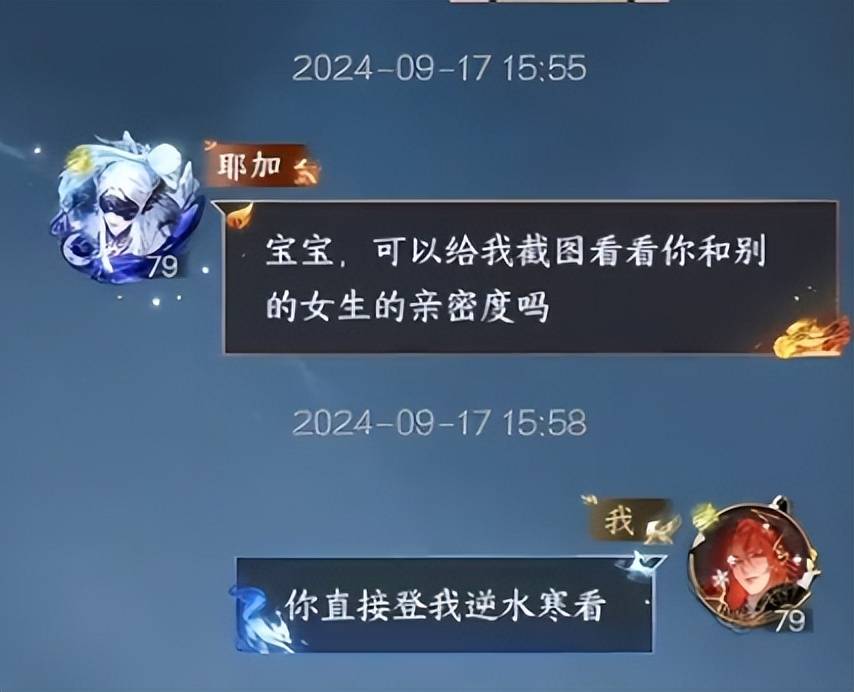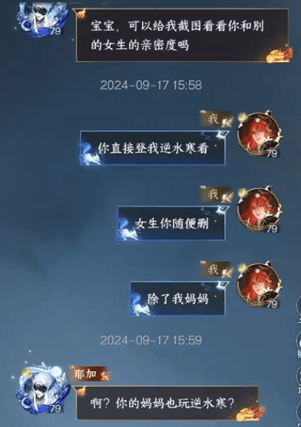 经过一段时间的斗智斗勇,男子想出一招对付情缘,他表示“你可以随便上号查看我的好友,也可以删除她们,但是不允许删除我妈妈”,引得情缘惊呼“你妈妈也玩逆水寒?”