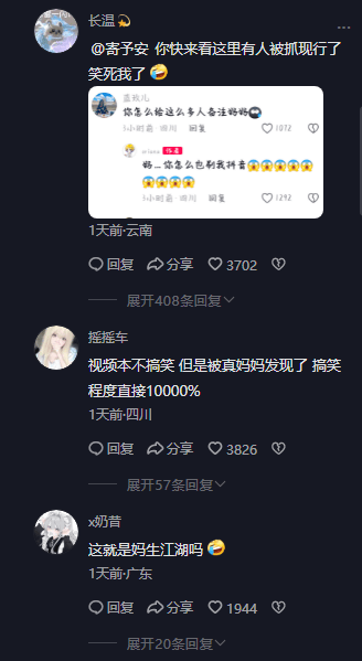 本来这事有点好笑,但也仅仅是小情侣谈恋爱的手段罢了。没想到男子兴奋晒到社交平台后,他妈妈半夜登陆游戏查儿子的岗,发现了这么多“妈妈”,直接在视频评论区逮着儿子就一通质问: