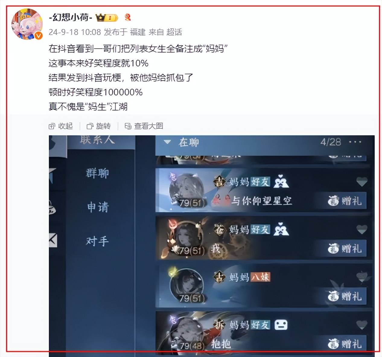 最近,一位男子在社交平台晒出自己玩《逆水寒》手游的视频,在视频中他展示了游戏通讯录里65个女网友,并且把这些女网友的ID都改成了“妈妈”,本来想秀一波人脉,不料遭到亲妈的“制裁”……