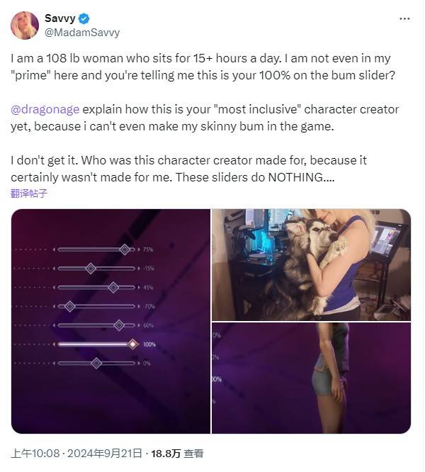 近日,《龙腾世纪:影障守护者》的一则角色创建视频引发了国外玩家的热议。女玩家MadamSavvy在社交媒体上表达了自己的观点,对游戏中的臀部滑杆表示不理解。她指出自己体重较低,坐在电脑前时间较长,并且年轻还不需要担心身材问题,但游戏中提供的臀部滑杆对她来说并没有实际作用。