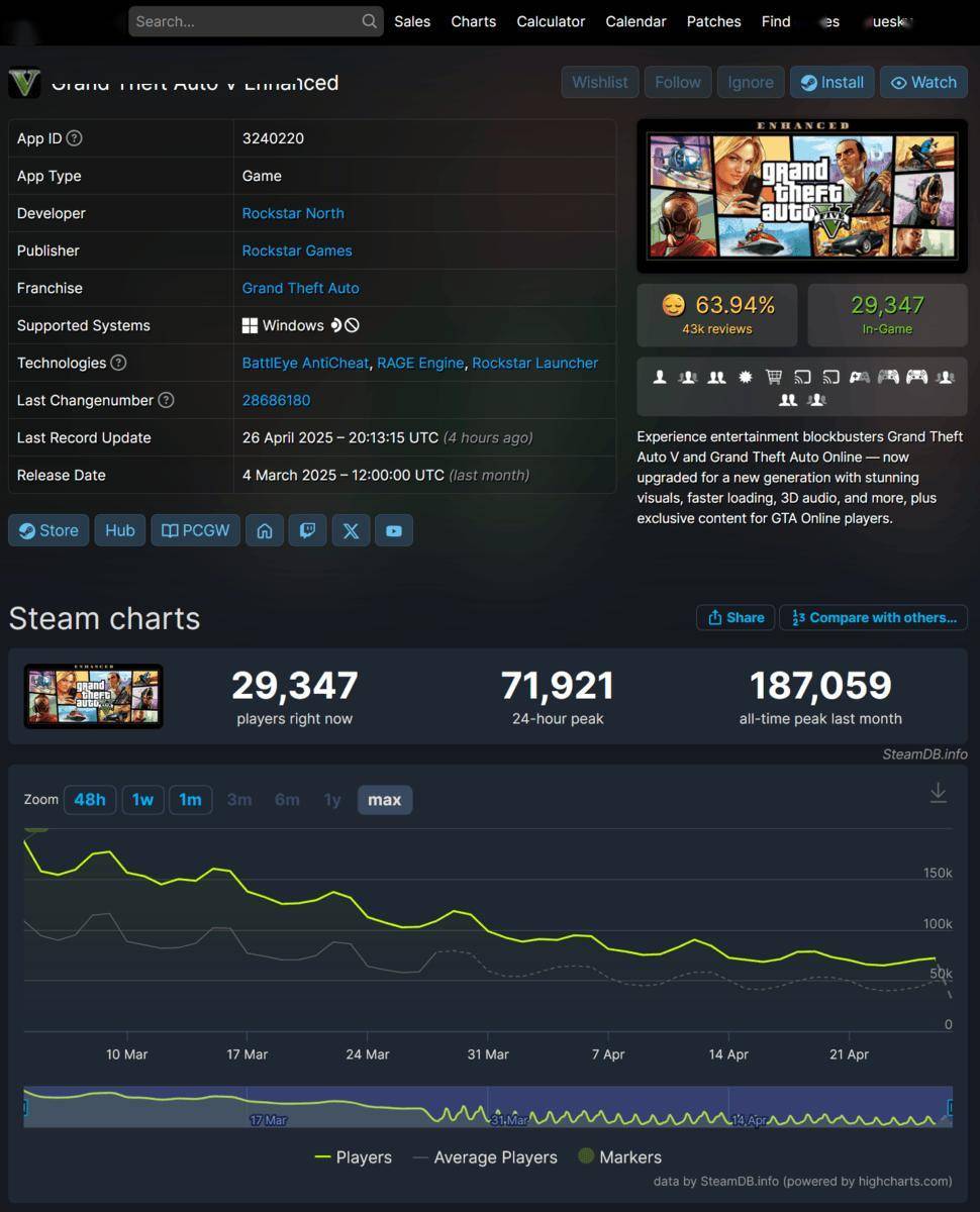 自《GTA 5 增强版》发布以来,尽管它带来了画面质量的显著提升以及更快的加载速度,但并未能如愿吸引大量PC玩家迁移。相反,原版游戏因其广泛的模组支持和稳定的功能表现,持续吸引着玩家回流。SteamDB的数据显示,增强版自首发日的18.7万峰值在线人数后,玩家数量逐渐下滑,目前已跌破7.2万,而原版则依然保有8.62万的活跃玩家。