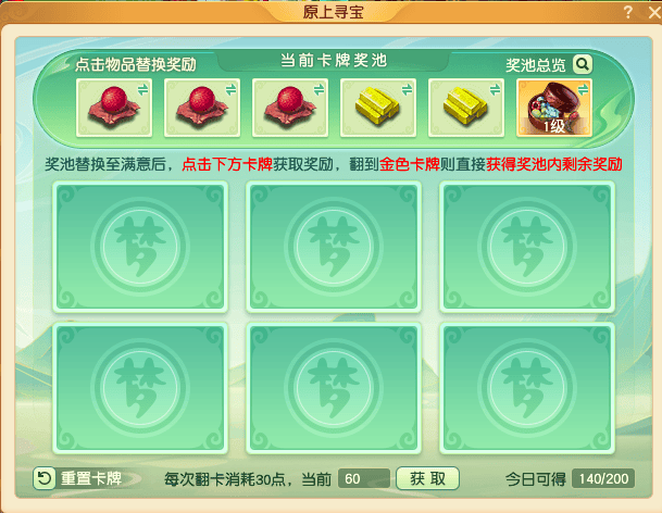 原上寻宝玩法类似于“新春翻一番”,每次翻牌需要消耗30点行动力,每日行动力上限为200点。