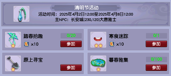 本次清明节活动时间为2025年4月2日12:00—2025年4月8日12:00,活动共有环任务、小副本、挂机玩法、特色玩法四个子项。不过,对于大家来说,清明节活动时间比较轻量,比较适合刷成就和需要大量经验的玩家。