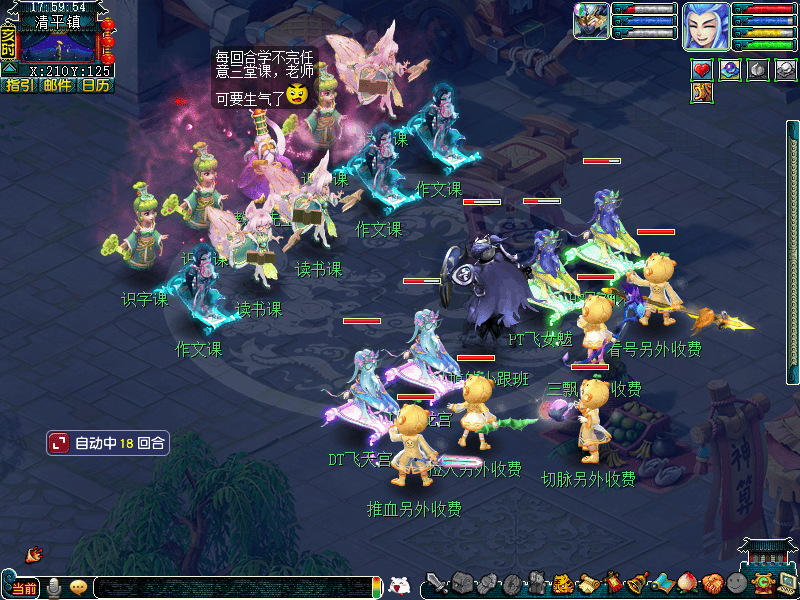 第六场战斗需要前往(210,125),点击教书先生才能对话。本场战斗建议采用须弥速推的策略,只要清完小怪,主怪就会逃跑,有提升战斗效率的作用。