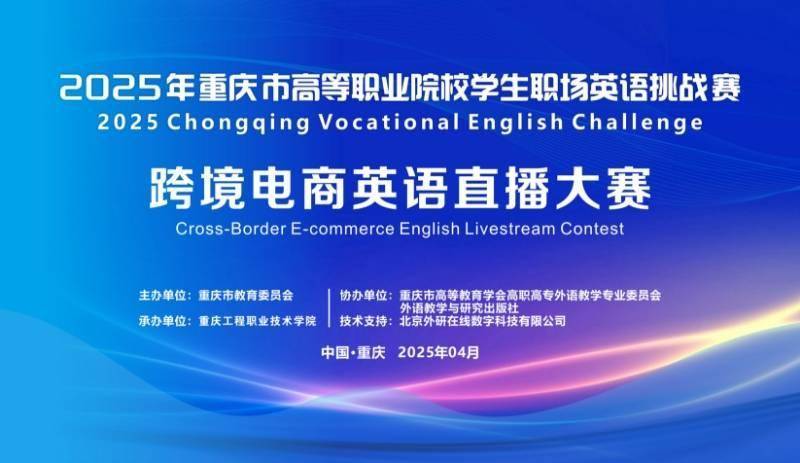4月26日,2025年重庆市高等职业院校学生职场英语挑战赛 跨境电商英语直播大赛在山城重庆圆满落下帷幕。本次大赛由重庆市教育委员会主办,重庆工程职业技术学院承办,重庆市高等教育学会高职高专外语教学专业委员会、外语教学与研究出版社协办,北京外研在线数字科技有限公司提供技术支持,协力为山城学子搭建展示英语应用能力与电商实战技能的高水平竞技平台,激扬青春风采,以赛促学、以赛促教、以赛促就,为重庆职业教育高质量发展注入创新动能。