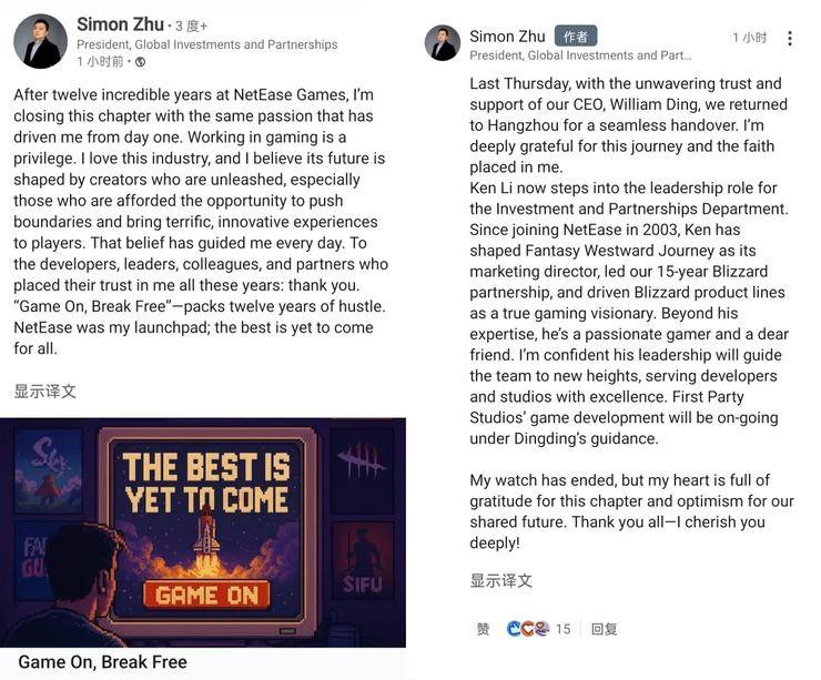 4月25日,网易游戏全球投资与合作部总裁朱原在领英上发布告别信,宣布在网易任职12年后正式离职。
