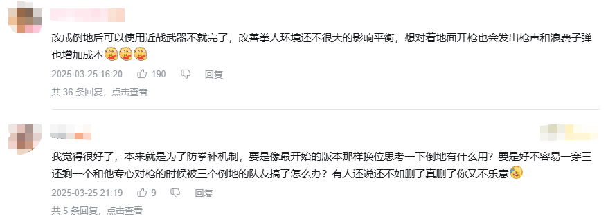 官方在收到玩家们的反馈后,迅速修改了“倒地射击”的机制,通过削弱性能和限制枪械,让其提供的反击能力保持在较为合理的范围。双方玩家们的游戏体验也得以维持在良好状态。