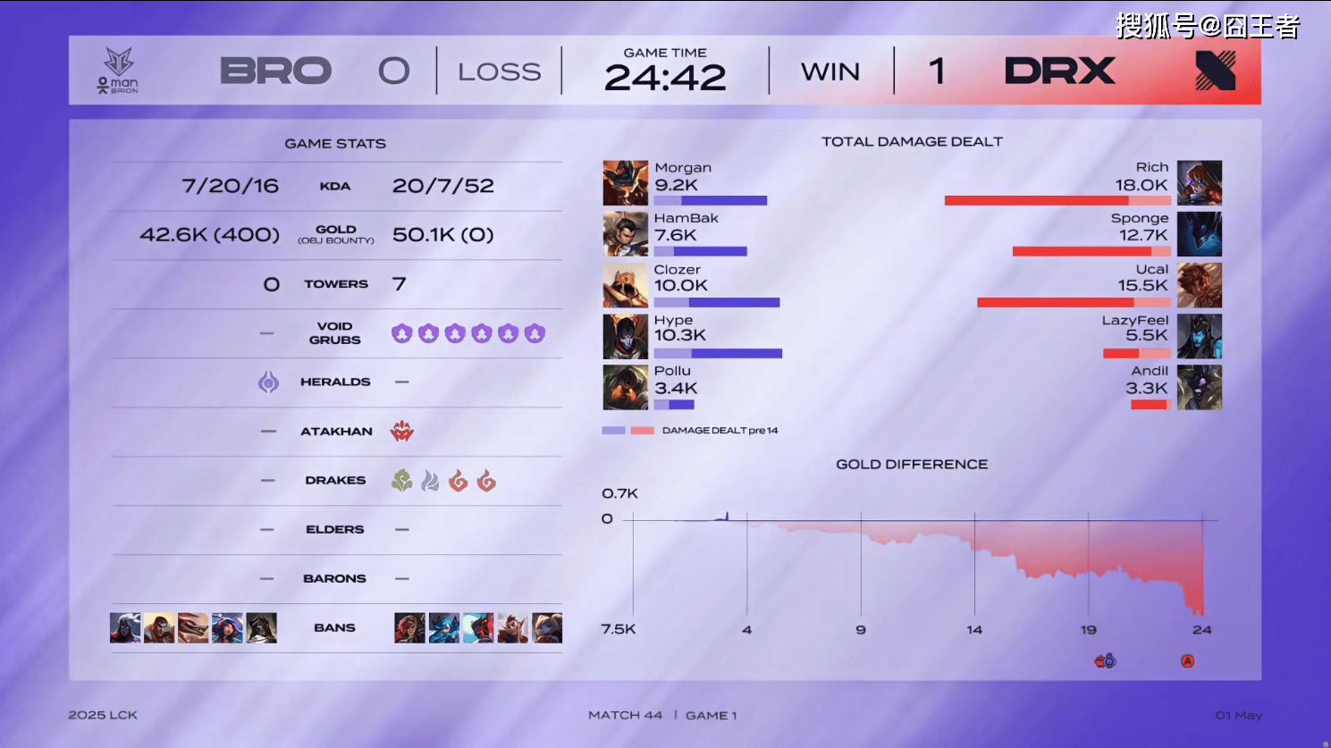 第一局比赛,BRO蓝色分,禁用:韦鲁斯、杰斯、纳亚菲利、妮蔻、烈娜塔,选用:Morgan兰博、HamBak赵信、Clozer沙皇、Hype烬、Pollu泰坦;DRX红色方,禁用:蔚、格温、永恩、洛、波比,选用:Rich阿萝拉、Sponge魔腾、Ucal岩雀、Teddy卡莉斯塔、Adil阿利斯塔