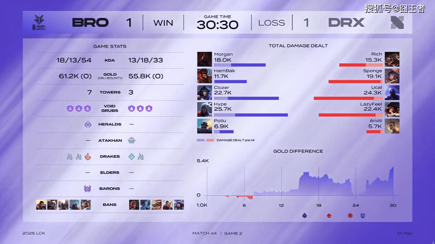 结果第二局比赛,BRO竟然不畏强队,扳回一局。比赛第4分钟左右,BRO下路越塔,打出1换1;比赛第7分钟左右,下路爆发团战,BRO打出1换3;比赛第15分钟左右,野区爆发团战,BRO打出1换5;比赛第16分钟左右,双方爆发先锋团,BRO打出3换3;比赛第23分钟左右,下路爆发团战,DRX打出1换5;最终比赛第30分30秒,爆发龙坑团,BRO打出0换4。