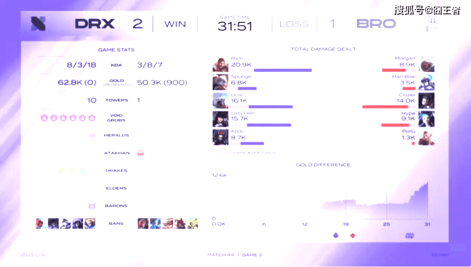 结果第三局比赛,被DRX利用新外援到来,打出了单方面的碾压局。比赛第4分钟左右,波比野区抓住机会击杀猪妹;比赛第6分钟左右,波比中路配合维克托抓死发条;比赛第13分钟左右,DRX野区抓住安蓓萨;比赛第15分钟左右,DRX上路再次击杀安蓓萨;比赛第20分钟左右,双方围绕厄塔汗爆发团战,猪妹抢下厄塔汗,BRO打出0换1;比赛第29分钟左右,波比关键大招,DRX打出0换2;最终比赛第31分51秒,DRX远古龙推进拿下比赛