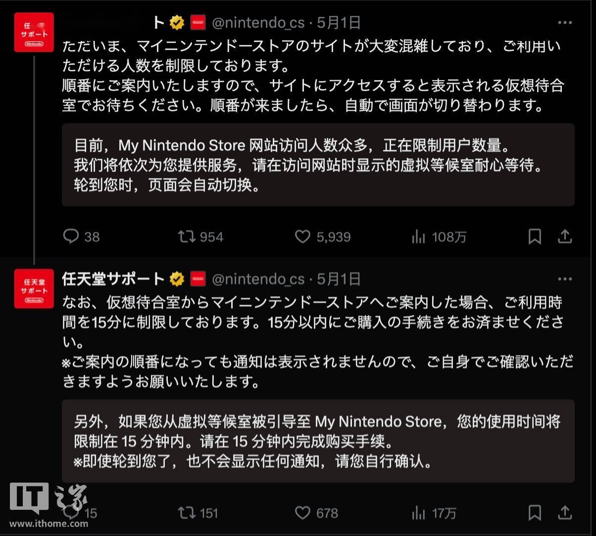 任天堂还提醒用户,成功进入商店后,页面使用时间限制为 15 分钟,务必在规定时间内完成下单。不过,仍有不少用户在 X 上反映“连购物车都进不去”,显示页面仍处于高负载状态。