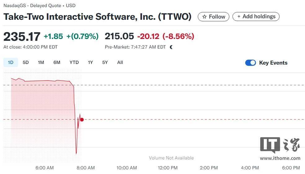 消息发布后,R 星母公司 Take-Two 的盘前股价闪降超 8%。